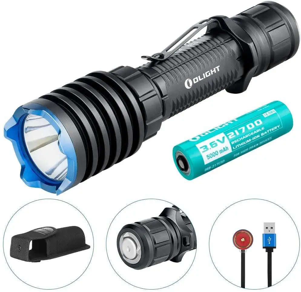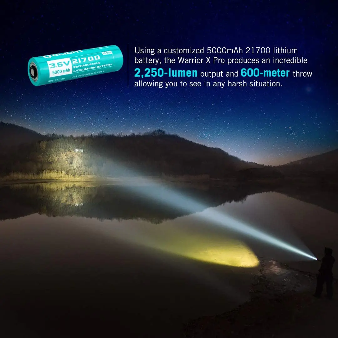 - 【Powerful Tactical Torch】Using a customized 5000mAh 21700 lithium battery, the Warrior X Pro produces an incredible 2,100-lumen output and 600-meter throw allowing you to see in any harsh situation.